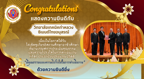 วิทยาลัยเทคนิคท่าหลวงซิเมนต์ไทยอนุสรณ์ โดยนายเฉลิมชนม์ เวทสรากุล ผู้อำนวยการวิทยาลัยเทคนิคท่าหลวงซิเมนต์ไทยอนุสรณ์ เข้ารับเกียรติบัตร รางวัลฟันเฟือง พชอ. จากโครงการพลัง พชอ. สระบุรี ครั้งที่ 4 ณ โรงแรมพาร์คอินน์ อำเภอเมืองสระบุรี จังหวัดสระบุรี ในวันที่ 26 สิงหาคม 2568 โดยมีคณะผู้บริหาร ครูและบุคลากรทางการศึกษา และนักเรียนนักศึกษา วิทยาลัยเทคนิคท่าหลวงซิเมนต์ไทยอนุสรณ์ เข้าร่วมพิธีในครั้งนี้ด้วย